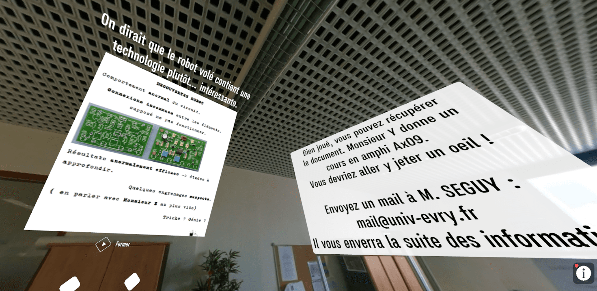 The experience follows a narrative-driven mystery, blending VR gameplay with real-world interactions such as quizzes and email exchanges. Each stage is designed around a pedagogical objective, particularly improving note-taking, information retention, and study organization through progressive challenges.